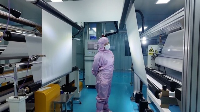 在园区内的湖南壹鑫科技有限公司无尘出产车间,光学薄膜自动化出产线正满负荷工作。
